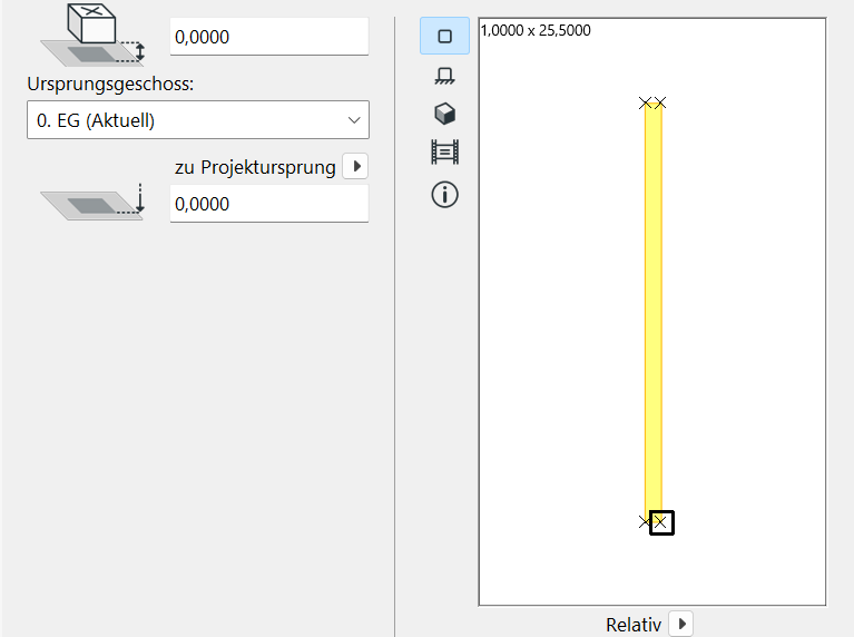 Die grundlegende Höhe des Objekts kann in der Registerkarte Vorschau und Positionierung nummerisch eingestellt werden. Es ist ebenso sinnvoll, eine Anpassung der Höhe mittels Bearbeitung direkt in Schnitt oder Ansicht vorzunehmen.