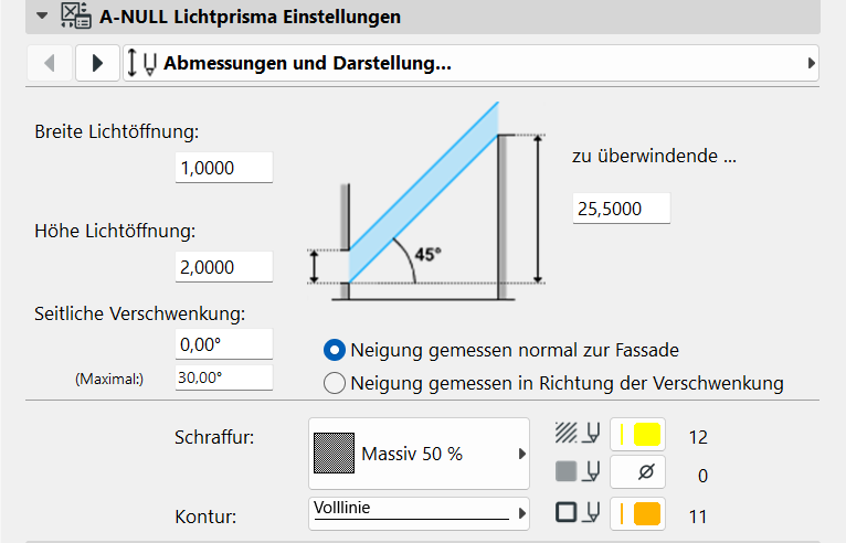 Bei der Werteingabe im rechten Teilbereich zu überwinden… kann der zu überprüfende Abstand zur Fassade eingegeben werden. Dabei wird der Lichteinfallswinkel von 45 Grad zur Horizontalen – gemessen von der Fassadenflucht – berücksichtigt. Die angeführte Skizze hilft bei der Interpretation.