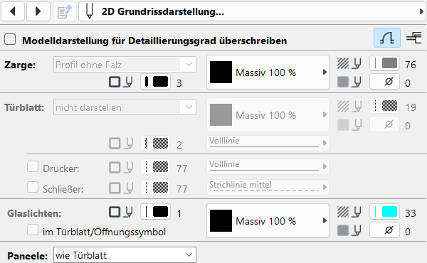 Der Detaillierungsgrad der Grundrissdarstellung richtet sich standardmäßig nach der Modelldarstellung. Bei abweichenden Anforderungen einzelner Elemente kann dieser individuell überschrieben werden. Die Einstellungen betreffen Zarge, Türblatt, Glaslichten und Paneele, wobei diesen die Einstellungen des Türblatts bzw. der Zarge zugewiesen werden können. Mehr zu den allgemeinen Optionen der Modelldarstellung hier.