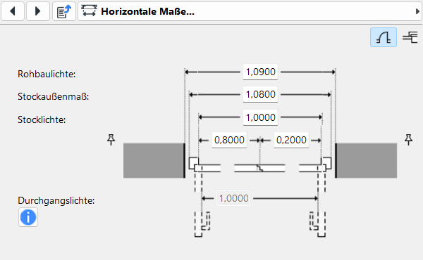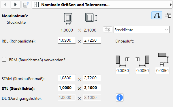 Abhängig von den Einstellungen bei Anschlag und Toleranzen (Einbauluft), werden die unterschiedlichen Werte für Rohbaulichte, Baurichtmaß, Stockaußenmaß und Stocklichte angezeigt. Das aktuelle Nominalmaß ist dabei stets hervorgehoben.