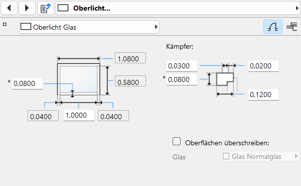 Die Einstellungen betreffen Geometrie, Kämpfer sowie individuelle Überschreibungen der Oberflächenmaterialien.
