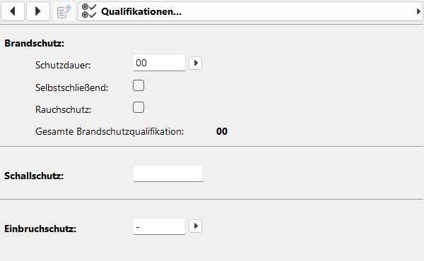 Unter Qualifikationen werden Werte für den Brandschutz, Schallschutz und Einbruchschutz hinterlegt.