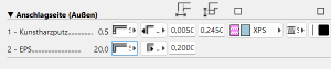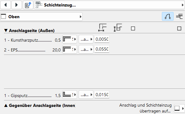 Die Anzeige der Schichten richtet sich nach dem mehrschichtigen Aufbau und der Anschlagtiefe. Die Auflistung gliedert sich nach Anschlagseite (außen/innen). Für jede angezeigte Schicht stehen die Optionen Schicht nicht einziehen, Schicht einziehen und Schicht einziehen, mit Einlage zur Verfügung. Je nach Option können rechts daneben Einstellungen getroffen werden, z. B. die Positionierung innerhalb oder außerhalb des Öffnungsmaßes, die Schichtstärke der eingezogenen Schicht sowie die Tiefe der Einlage in Bezug auf den Rahmen. Ergänzend werden für die Einlage Baustoff, Schraffurausrichtung und Schraffur-Vordergrundstift definiert.