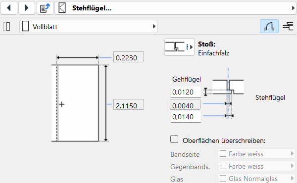 Die Einstellungen betreffen Geometrie, Stoß zwischen den Türblättern sowie individuelle Überschreibungen der Oberflächenmaterialien. Die Registerkarte passt ihren Inhalt entsprechend der Auswahl an.