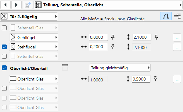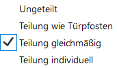 Hinweis: Bei der Auswahl Teilung wie Türpfosten werden automatisch zwei zusätzliche Oberlichtfelder aktiviert. Bei anderen Optionen erfolgt die Aktivierung der Felder manuell.