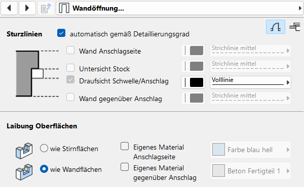 Unter dem Punkt Wandöffnung können die Darstellung der Sturzlinien im Grundriss und die Oberflächen der Fensterlaibung im Modell definiert werden.