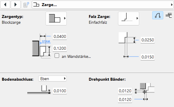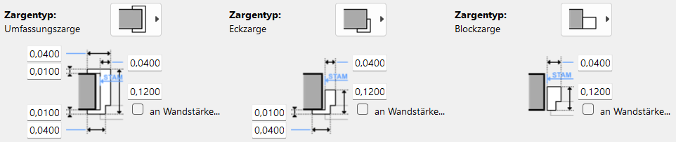 Als Optionen stehen Eckzarge, Umfassungszarge und Blockzarge zur Verfügung. Je nach Auswahl können sämtliche Maße eingetragen werden. Für die Gesamttiefe kann über die Option an Wandstärke anpassen eine Verknüpfung mit der Wandstärke gesetzt werden.