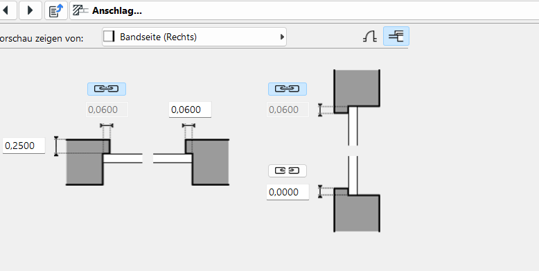 Der Anschlag kann über eine schematische Grundriss- und Schnittdarstellung gesteuert werden. Im Grundriss wird die Anschlagtiefe angezeigt, welche mit dem Wert unter Vorschau und Positionierung korreliert. Über das Setzen des Kettensymbols