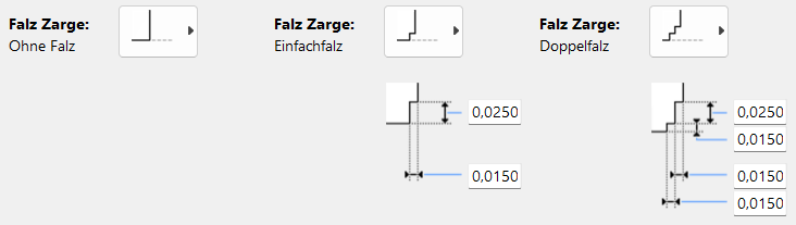 Die Geometrie der Zarge kann umfangreich eingestellt werden. Zu den Optionen zählen Zargentyp, Falz, Bodenabschluss sowie Drehpunkt der Bänder.
