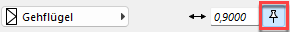 -Symbol wird nur bei einer 2-flügeligen Tür angezeigt und ermöglicht, einen Flügel auf eine feste Breite zu stellen. Änderungen wirken sich somit nur auf den anderen Flügel aus. Das Maß auf der Anschlagseite der schematischen Türdarstellung zeigt gemäß den Einstellungen unter Durchgangslichte den aktuellen Wert an, z. B. mit Abzug von in die Öffnung ragender Türgriffe.