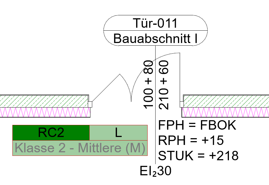 Je nach Wert wird darunter angezeigt, um welchen Parameter es sich handelt. Brandschutz-, Schallschutz- und Einbruchschutzqualifikation stammen aus den A-NULL Tür-Einstellungen. Bei Verwendung des A-NULL Türmarkers mit einer Standard-Tür steht an dieser Stelle statt Einbruchschutzqualifikation der Wert Wärmedurchgangskoeffizient zur Verfügung. Bei Verwendung der Brandschutzeigenschaften kann auch der Brandschutzausdruck über eine Eigenschaft angezeigt werden.