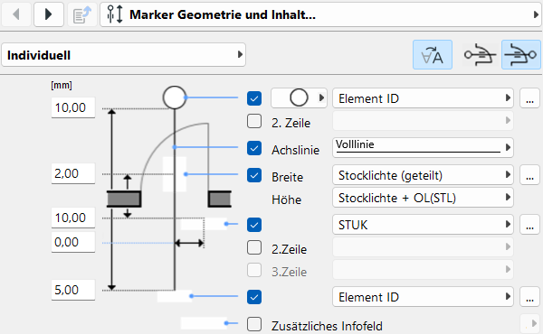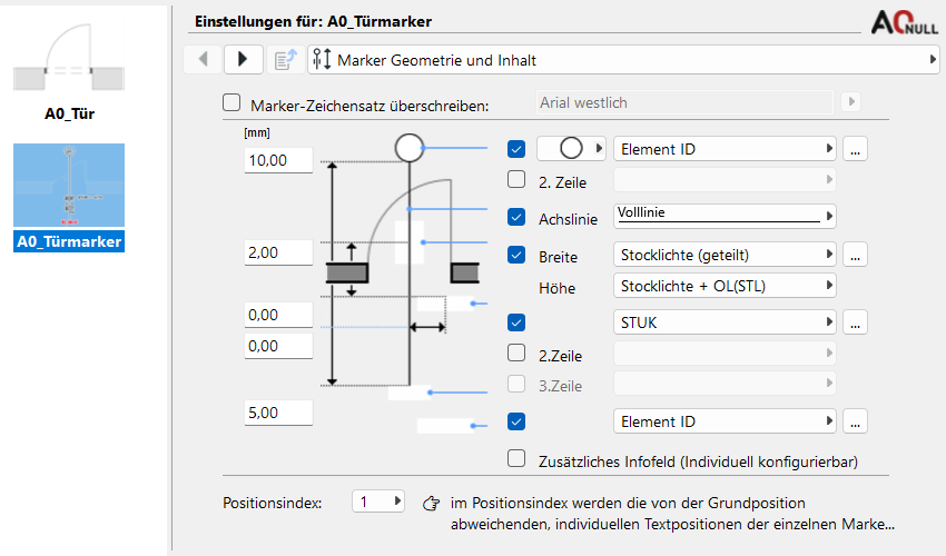 Geometrie und Inhalt des A-NULL Türmarkers können flexibel gesteuert werden. Zunächst wird eine Komponente aktiviert, dann definiert.