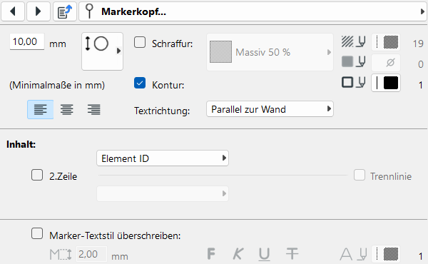 Für den Markerkopf gibt es neben Größe und Form noch zahlreiche weitere Einstellungen bezüglich Schraffur, Kontur und Textrichtung.