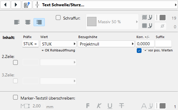 +/- Fußbodenst. bedeutet, dass der Wert für die Fußbodenstärke aus dem Register Bemaßungsmarker und Stempel berücksichtigt wird.